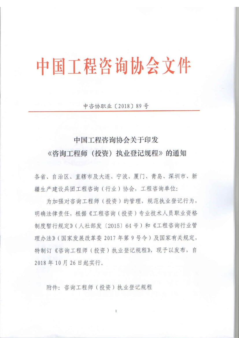 第三十條 本規(guī)程自 2018 年 10 月 26 日起實(shí)行。中咨協(xié)會(huì)2017 年 12 月 15 日發(fā)布的《咨詢工程師(投資)登記規(guī)程》